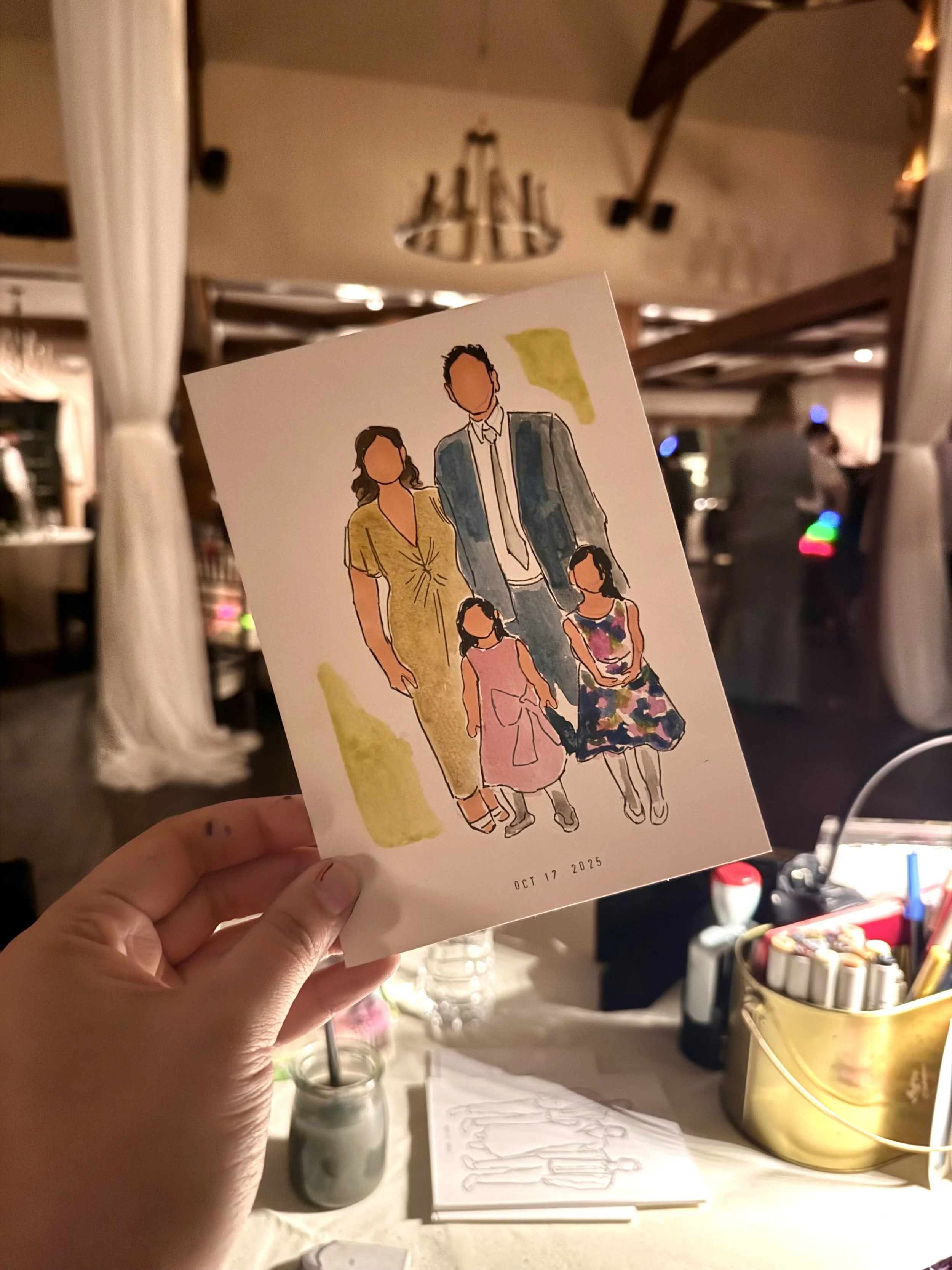 Include your guests on the fun and wonder that comes with live painting. I will paint watercolor sketches your beloved family and friends on site throughout the reception. They make a lovely and unique favor to remember your big day.